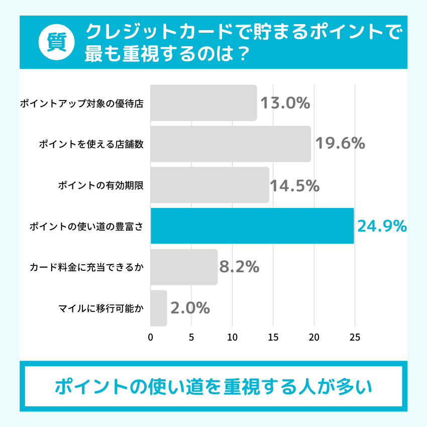 モノコレが行ったアンケート調査でも、クレジットカードで貯まるポイントで最も重視する点として、多くの方が”ポイントの使い道の豊富さ”を挙げています。